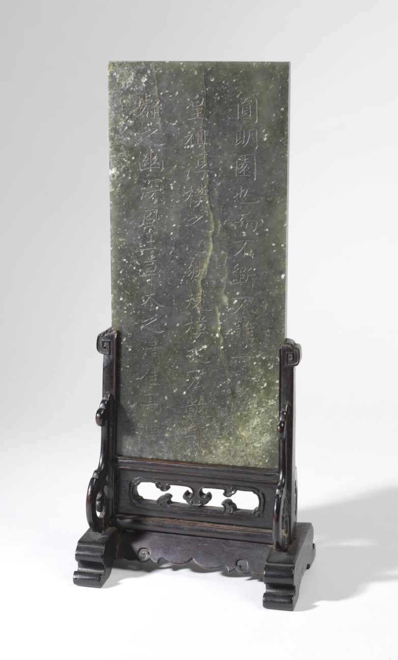 7. Настольная ширма со стойкой, выполненные из резного и позолоченного нефрита тёмно-зелёного цвета, резного лака с инкрустацией и резного тикового дерева. Китай, около 1800–1900 гг.