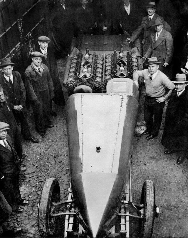 Американский гонщик Рэй Кич у своего 36-цилиндрового автомобиля White Triplex. Атлантик-Сити, 18 февраля 1928 года.