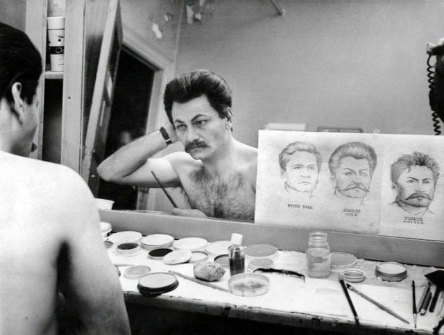 Американский актёр Питер Фальк наносит грим, готовясь к роли Иосифа Сталина в бродвейской постановке «The Passion of Josef D.», Нью-Йорк, 1963 год.