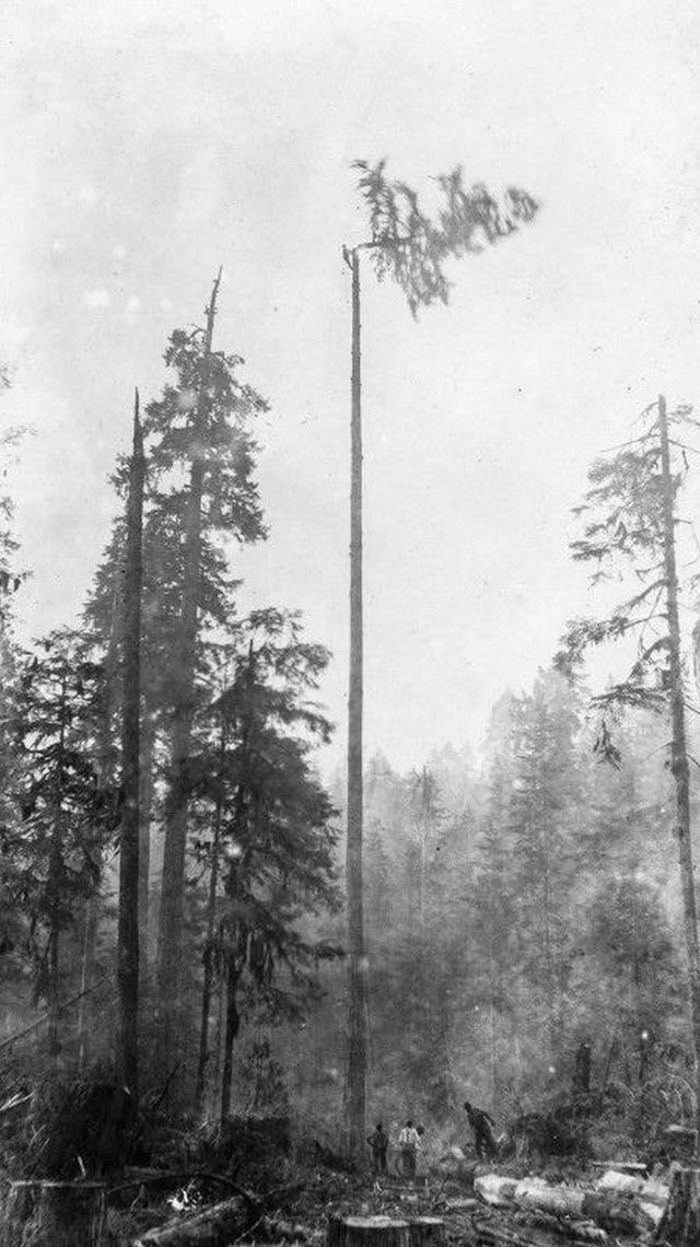 Лесоруб обрезает верхушку дерева в Британской Колумбии, 1920-е годы.