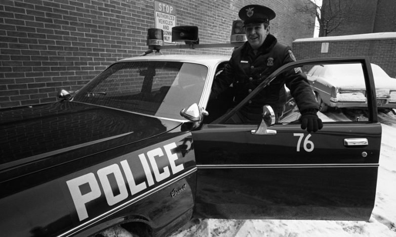 Январь 1976 года. Анн-Арбор, Мичиган. Офицер полиции Дж. Роберт Зайферт демонстрирует новый полицейский автомобиль.