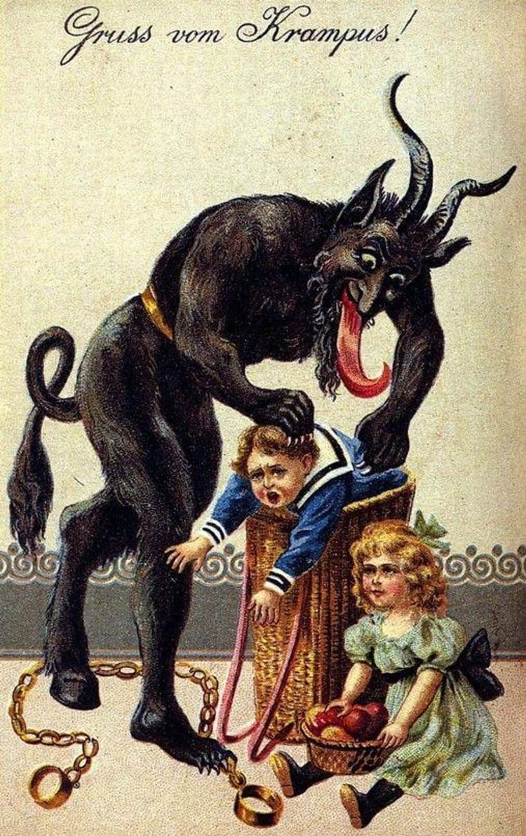 В Европе у Санта-Клауса есть Крампус — рогатый демон, который наказывает непослушных детей, избивает их розгами или утаскивает в мешке в ад.