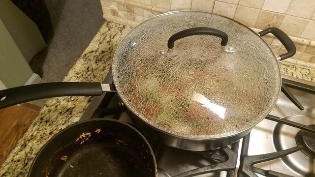 4. Крышка сковородки потрескалась и скоро приправит еду стеклом
