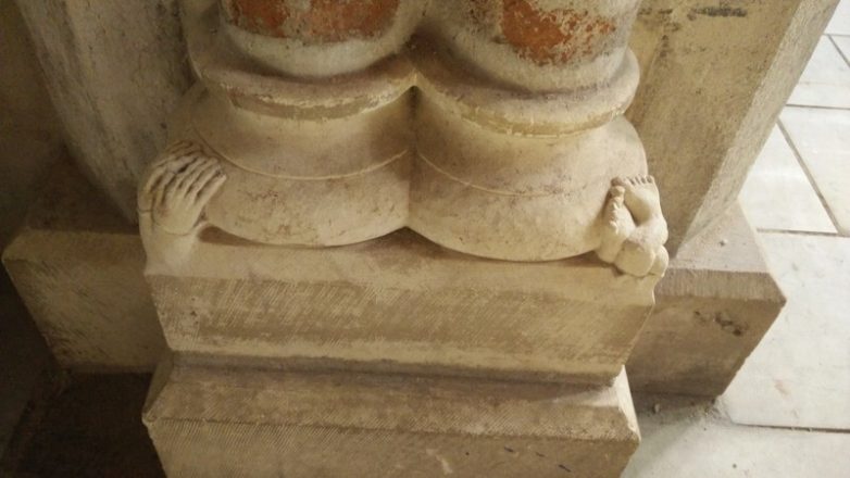 Церковь Якобинцев в Тулузе знаменита мощами Фомы Аквинского. Гораздо менее известно, что у основания колонны за золочёной ракой виднеется странная резьба: торчащие из камня костлявые руки и пухлые скрещённые ступни, будто некто был раздавлен опорой. Происхождение и смысл этой детали затерялись во времени. Её легко пропустить, и даже некоторые гиды не знают о её существовании.