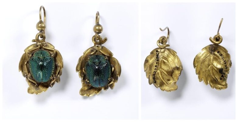 12. Серьги в виде вредных черепашек на позолоченных металлических листьях, Англия (ок. 1850 г.), Музей Виктории и Альберта
