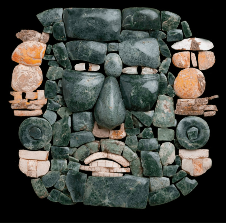 Найдена в гробнице основателя правящей династии майя. Маска составлена из множества кусочков нефрита (символизирующего вечность, жизнь и власть) и, возможно, перламутра или раковин морских устриц (символизирующих подземный мир и воду), что отражает веру майя в загробную жизнь и статус умершего. Такие маски часто помещали в царские погребения, чтобы защитить лицо усопшего и обеспечить ему божественный статус в мире предков.