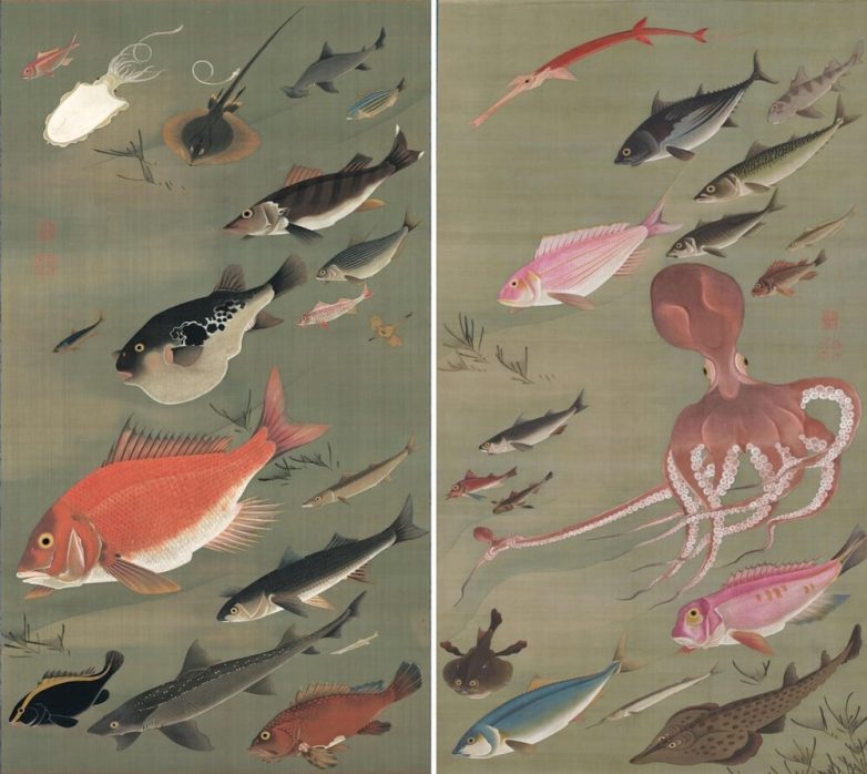 13. «Рыбы и осьминог (из серии «Цветное царство живых существ»)», созданная японским художником Ито Дзякутю в 1765-1766 годах н.э. В настоящее время хранится в Музее Императорских коллекций в Токио