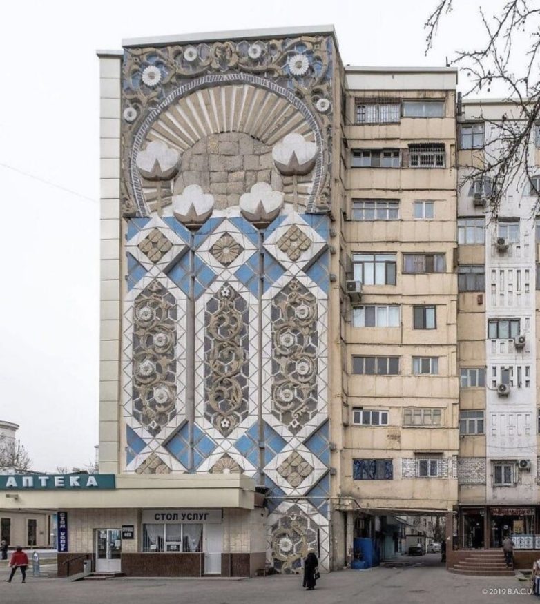 Во всю стену жилого дома, построенного в 1974-м году в Узбекистане, выложено панно с изображением хлопка, главного сырьевого ресурса этой страны