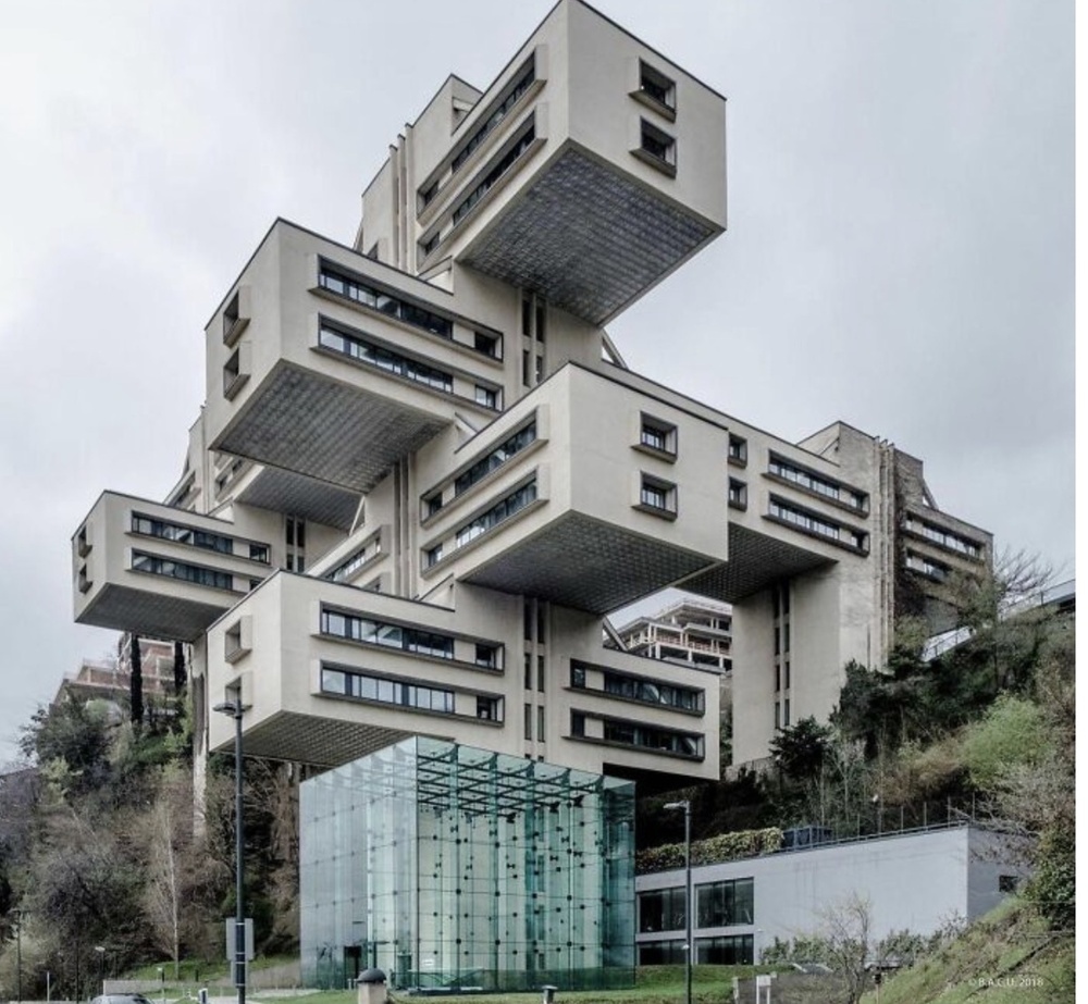 Необычный архитектурный проект был реализован в Грузинской ССР в 1975-м году. В здании размещалось Министерство автомобильных дорог. Сейчас оно принадлежит Банку Грузии