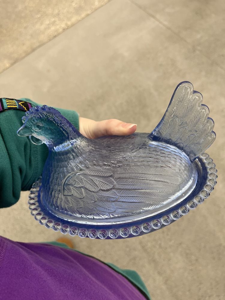 16. «Моя жена наконец-то нашла в комиссионном магазине целую винтажную стеклянную фигурку курицы василькового цвета из Индианы 70-х годов»