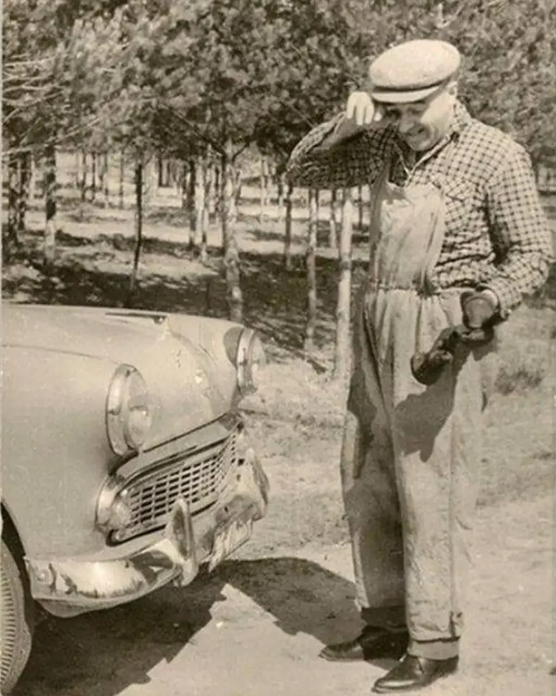 Владимир Этуш пытается починить свой Москвич-407. 1950-е годы