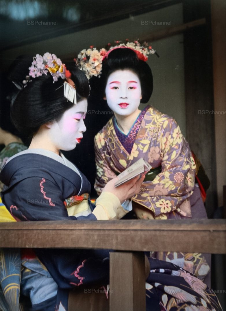 Женщины читают в традиционных костюмах, Киото, Япония, апрель 1954 года.