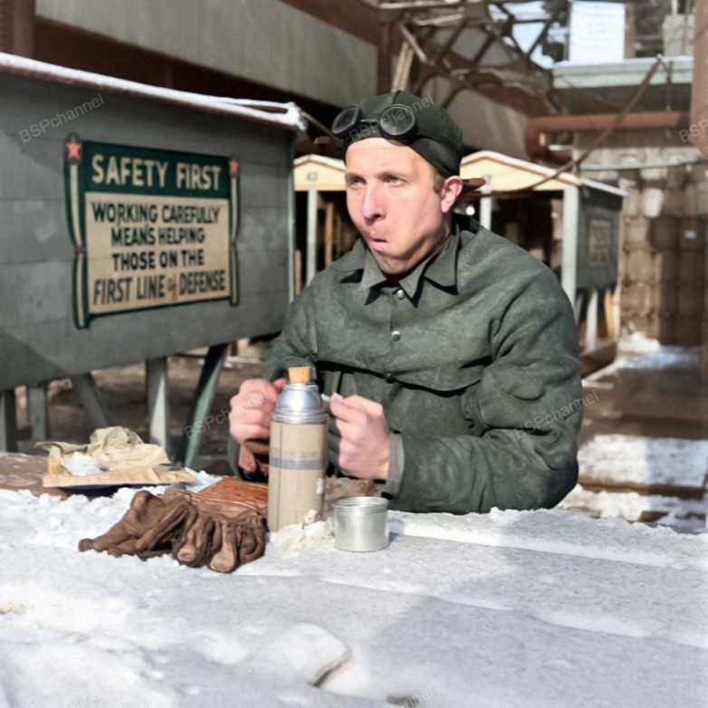 Рабочий на перерыве на Бруклинской военно-морской верфи, 1941 год.