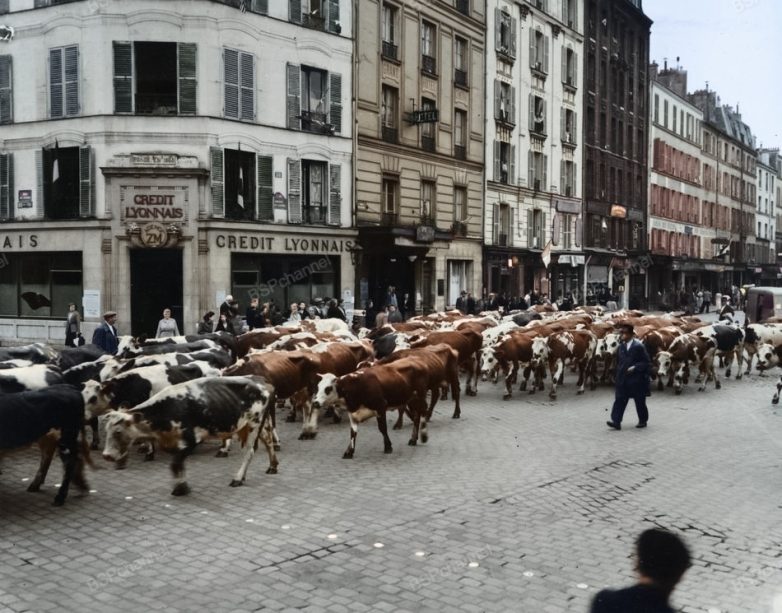 Эти коровы направляются на бойни Вожирар. Подобная практика — гнать скот прямо по улицам Парижа сохранялась вплоть до 1970-х годов, пока бойни Вожирар наконец не закрыли. Поговорка «увидеть Париж и умереть» заиграла другими красками…