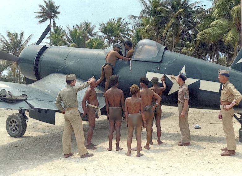 Американские летчики показывают туземцам палубный истребитель F4U «Корсар» (Chance Vought F4U Corsair), 1945 год.