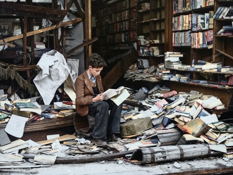 Мальчик, читающий книгу в разбомбленном лондонском книжном магазине, 1940 год.