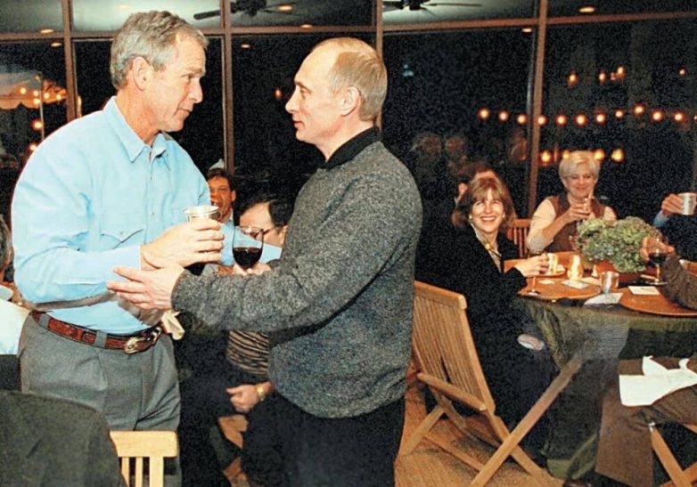 Владимир Путин и Джордж Буш выпивают вино на глазах у оживлённых посетителей американского ресторана, 2001 год