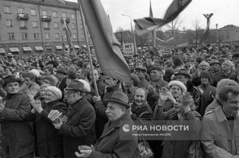 События, последовавшие после принятия решения о восстановлении независимости республики Верховным Советом Литвы 11 марта 1990 года. Митинг протеста, организованный движением «Единство», против решений Верховного Совета Литвы у здания ВС Литовской ССР.