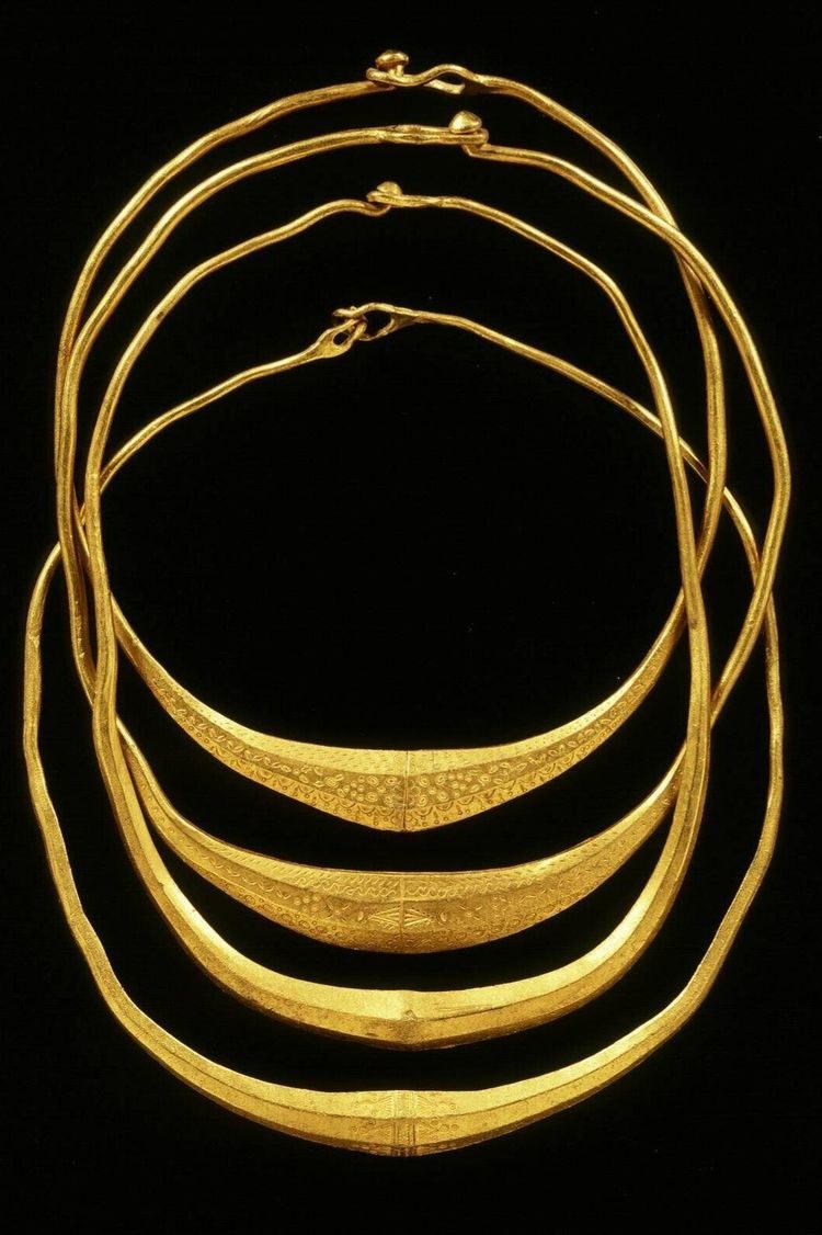 8. Четыре германских золотых ожерелья, изготовленные около 400 г. н.э. из переплавленных позднеримских золотых монет. Они были найдены в 1952 году недалеко от Ольста в Нидерландах и сейчас хранятся в Рейксмузее старины