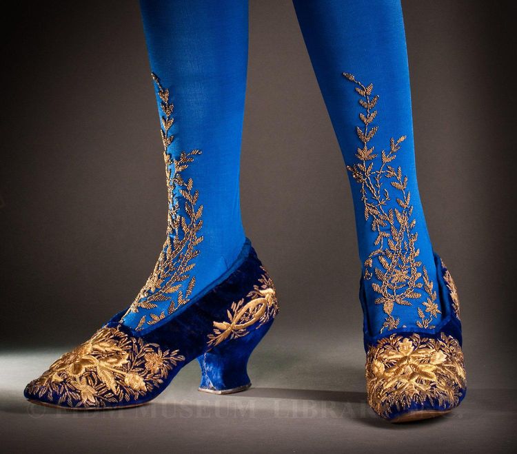16.Пара туфель и вышитые чулки, около 1890 г. н.э., работы К. Тишера. Туфли изготовлены из темно-синего бархата и вышиты позолоченной пластиной поверх бумаги, создавая абстрактные цветочные узоры