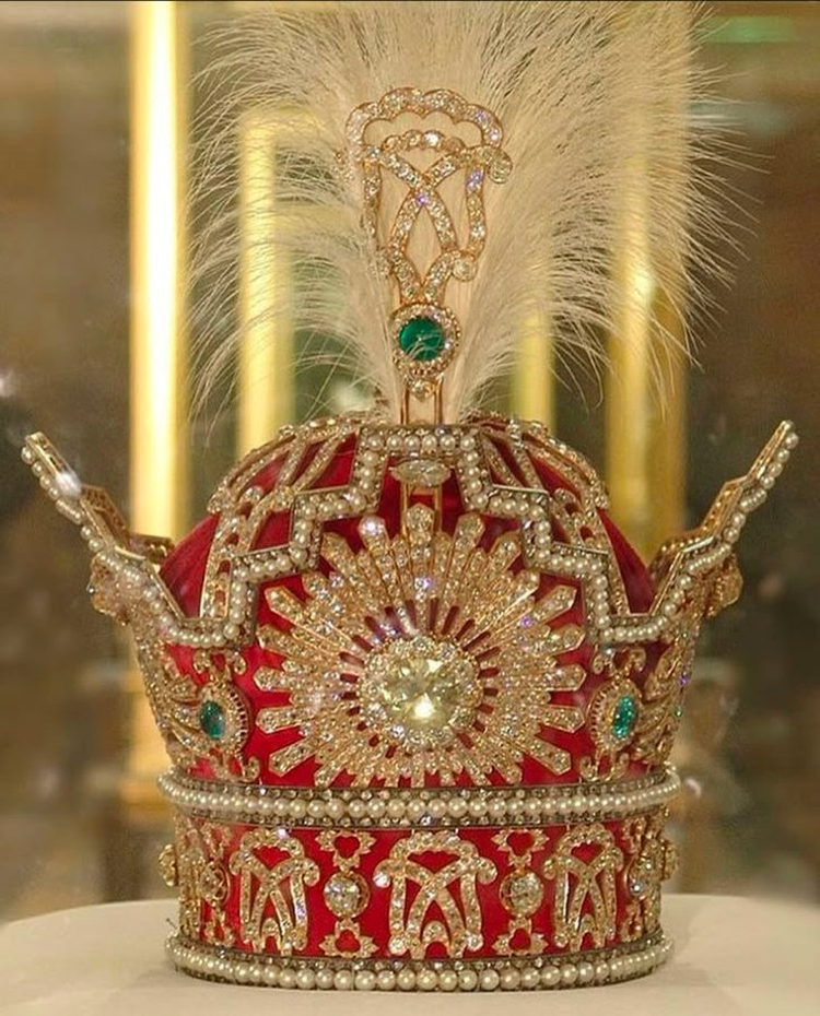 7. Императорская корона династии Пахлави, Иран, 1926 год. Украшена 3380 бриллиантами (общим весом 1144 карата, включая центральный желтый бриллиант бриллиантовой огранки весом 60 карат), 5 изумрудами, 2 сапфирами и 369 натуральными белыми жемчужинами, а также более мелкими акцентами