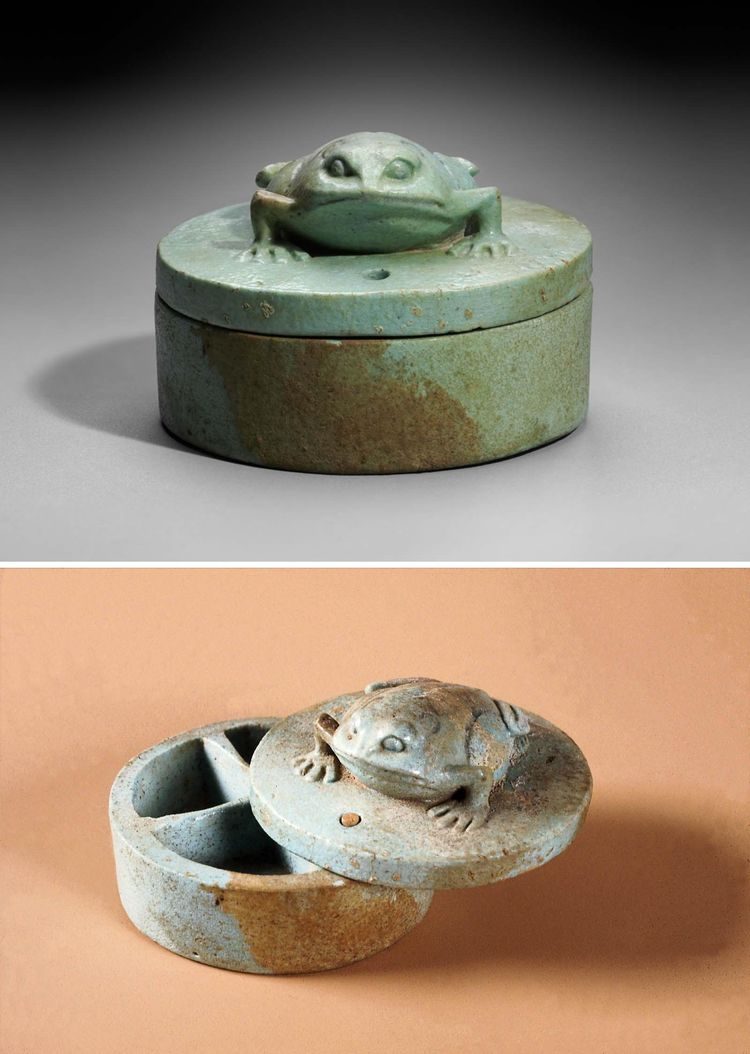 13. Круглая косметическая шкатулка из фаянса сине-зеленого цвета с изображением присевшей лягушки на откидной крышке. Египет, 600–500 гг. до н.э., в настоящее время хранится в Музее изящных искусств в Бостоне