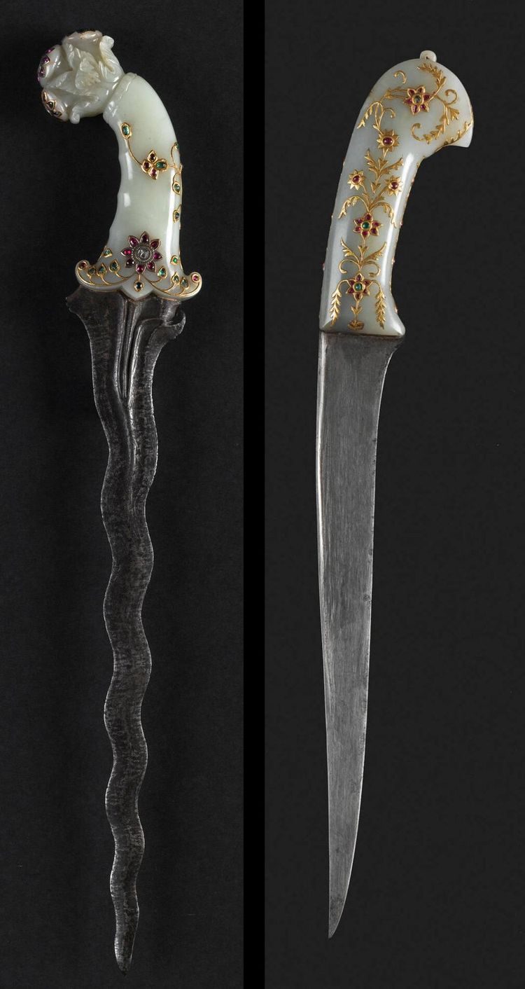 9. Фруктовый нож царицы Нур Джахан, 20-й жены императора Джахангира, с рукояткой в виде головы попугая, выполненной из нефрита, рубина и изумруда. Индия, империя Великих Моголов, XVII век