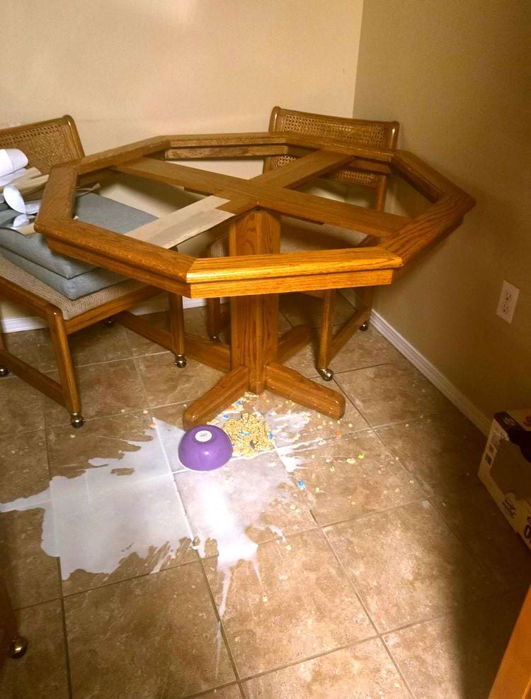 Автор фото поставил миску с молоком и хлопьями на стол… на котором не было стекла.
