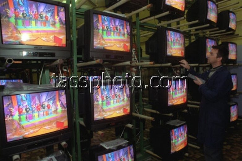 Кинескопы фирмы «Филлипс», а также российские, воронежского производства. Великий Новгород, 1999 год. На снимке: инженер-регулировщик Евгений Крупин следит за работой телевизоров на прогоне.