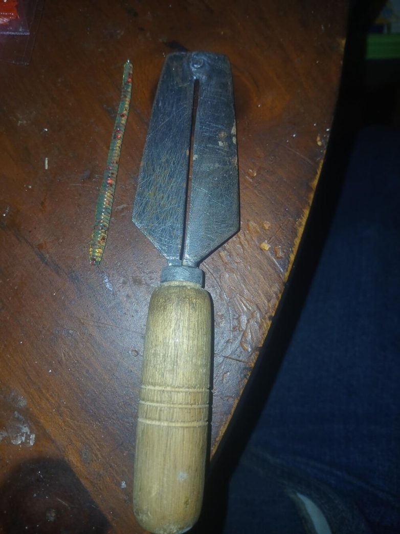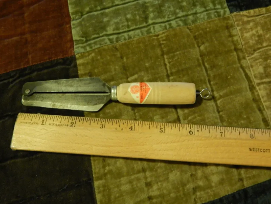 Старинная овощечистка. Может раскладываться и использоваться как нож или складываться как двусторонняя овощечистка.