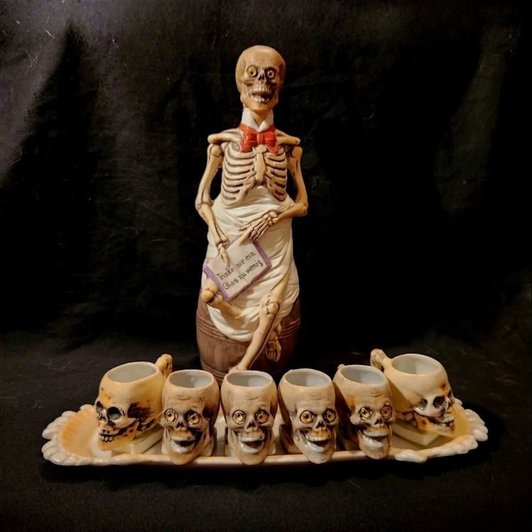 8. Набор для шнапса/ликёра. Скелетик указывает в книжке на строчку «Trinke nie ein Glas zu wenig» («Никогда не пей на рюмку меньше») — название немецкой студенческой застольной песни 1855 года, позже ставшей народной