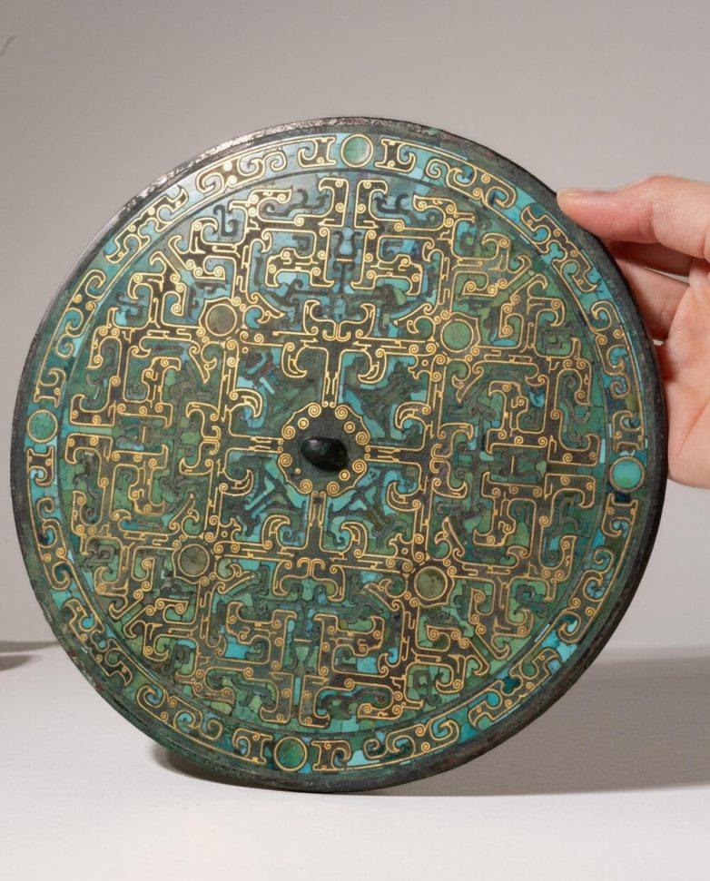 11. Бронзовое зеркало, инкрустированное бирюзой и золотом, династия Восточная Чжоу, период воюющих царств (около 475-221 гг. до н.э.), из Китая