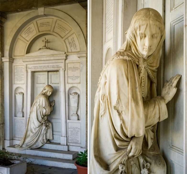 1. Мраморный надгробный памятник семье Досси Рампинелли Спаленца, изготовленный Джованни Баттистой Ломбарди в 1856 году, расположенный на Монументальном кладбище в Брешии, Италия