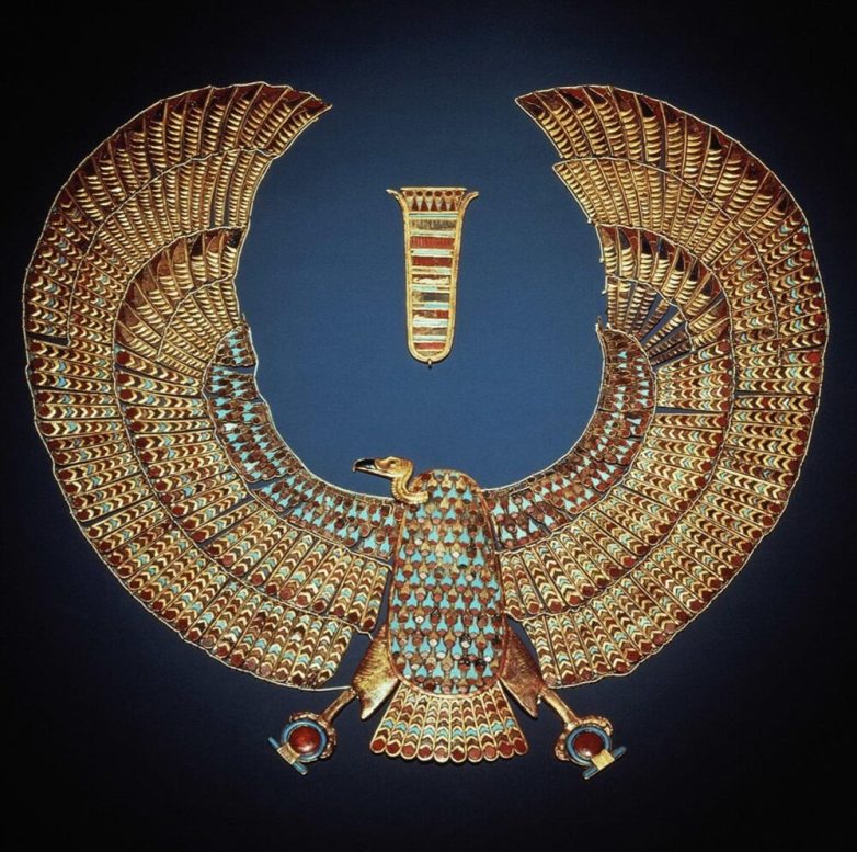 17. Большой золотой ошейник Тутанхамона в виде стервятника (1323 г. до н.э.) с удлинёнными крыльями, состоящими из 250 сегментов и инкрустированными полихромным стеклом