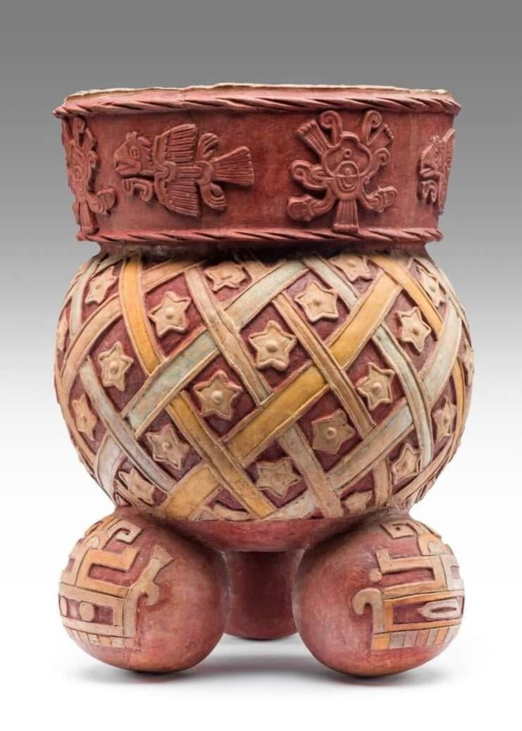 15. Керамическая жаровня с тремя сферическими подставками, найденная в Туле в Мексике. Поздний постклассический период (1250-1521 гг. н.э.), ныне хранящаяся в Национальном музее антропологии в Мехико