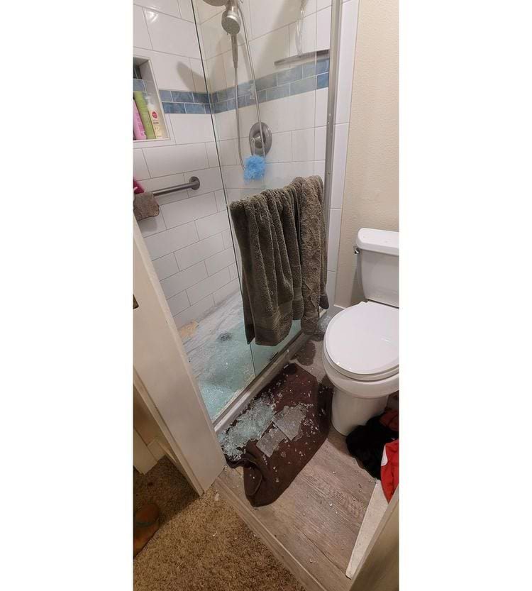 «Сегодня вечером мой 7-летний ребенок принимал душ в стеклянной душевой кабине. Bluetooth-колонка упала со стенки кабинки, отскочила от его спины и ударилась о дверь, которая взорвалась. К счастью, с ним все в порядке», — написал автор фото