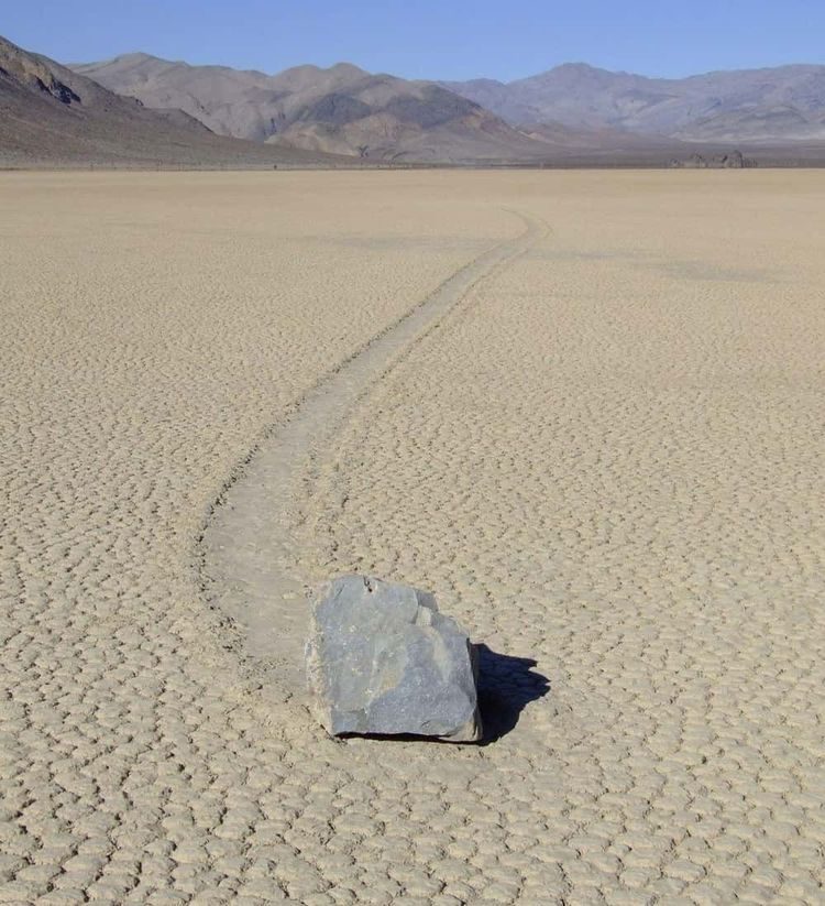 На высохшем дне озера Рейстрек-Плайя в американской Долине Смерти можно увидеть камни, которые словно сами ползут по земле, оставляя за собой длинные следы.