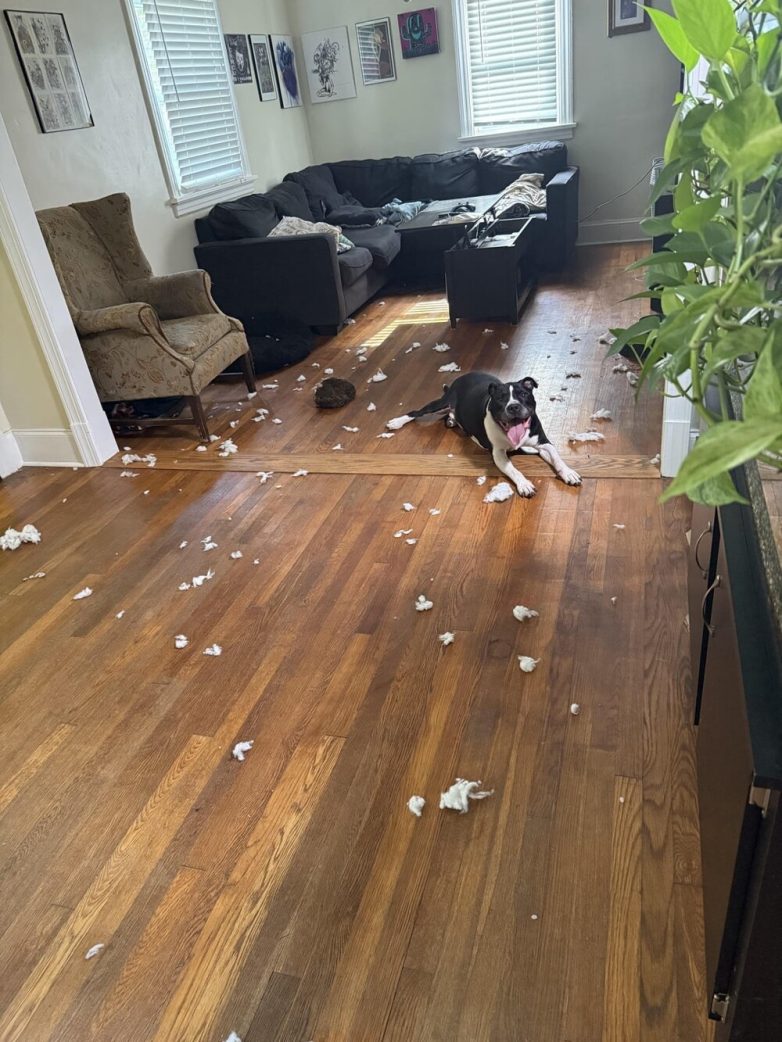 Впрочем, когда видишь виноватую, но при этом невероятно счастливую морду посреди хаоса, понимаешь, что это не разруха, а искусство быть счастливым здесь и сейчас, которому можно только позавидовать. А подушка — это всего лишь вещь, которая не особенно вписывалась в интерьер и давно нуждалась в замене.